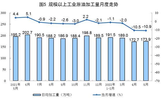 原油加工量繼續(xù)下降。5月份,加工原油5392萬噸,同比下降10.9%,降幅比上月擴(kuò)大0.4個百分點,日均加工173.9萬噸。1—5月份,加工原油27716萬噸,同比下降5.3%。