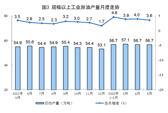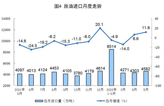 原油生產(chǎn)平穩(wěn),進(jìn)口有所加快。5月份,生產(chǎn)原油1757萬噸,同比增長3.6%,增速比上月放緩0.4個百分點,日均產(chǎn)量56.7萬噸。進(jìn)口原油4582萬噸,同比增長11.8%,比上月加快5.2個百分點。