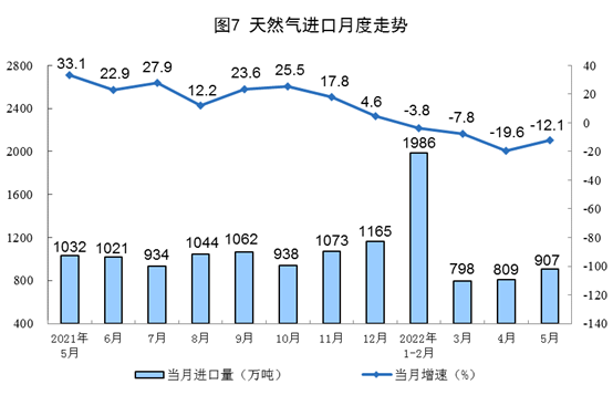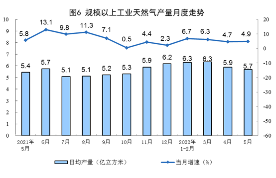 天然氣生產(chǎn)保持穩(wěn)定,進(jìn)口降幅收窄。5月份,生產(chǎn)天然氣177億立方米,同比增長4.9%,增速比上月加快0.2個百分點,日均產(chǎn)量5.7億立方米。進(jìn)口天然氣907萬噸,同比下降12.1%,降幅比上月收窄7.5個百分點。
