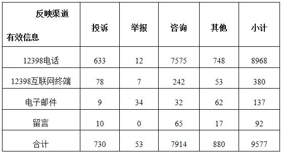 按反映渠道分類(lèi),12398電話(huà)8968件,12398互聯(lián)網(wǎng)終端380件,電子郵件137件,留言92件。