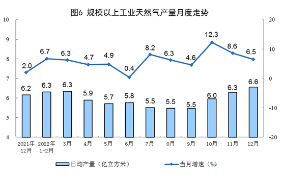 天然氣生產(chǎn)增速有所放緩,進口降幅擴大。12月份,生產(chǎn)天然氣204億立方米,同比增長6.5%,增速比上月放緩2.1個百分點,日均產(chǎn)量6.6億立方米。進口天然氣1028萬噸,同比下降11.8%,降幅比上月擴大9.0個百分點。