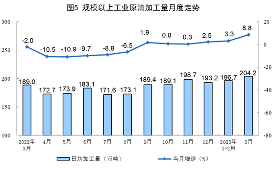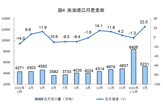 原油生產(chǎn)略有加快,進(jìn)口由降轉(zhuǎn)增。3月份,生產(chǎn)原油1818萬噸,同比增長2.4%,增速比1—2月份加快0.6個(gè)百分點(diǎn),日均產(chǎn)量58.7萬噸。進(jìn)口原油5231萬噸,同比增長22.5%,1—2月份為下降1.3%。