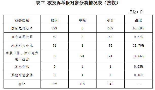 供電企業(yè)542件、占投訴舉報(bào)總數(shù)的84.55%,其中國家電網(wǎng)公司405件、占投訴舉報(bào)總數(shù)的63.18%,南方電網(wǎng)公司62件、占投訴舉報(bào)總數(shù)的9.67%,地方電力企業(yè)75件、占投訴舉報(bào)總數(shù)的11.70%;承裝(修、試)電力施工企業(yè)94件、占投訴舉報(bào)總數(shù)的14.66%;發(fā)電企業(yè)4件、占投訴舉報(bào)總數(shù)的0.63%;其他市場主體1件、占投訴舉報(bào)總數(shù)的0.16%。