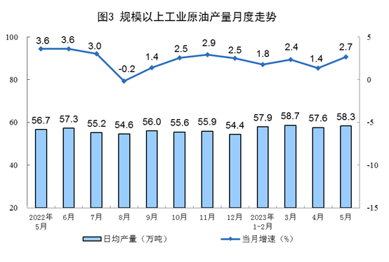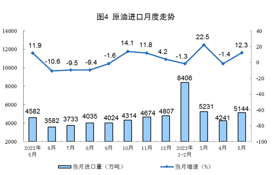 原油生產(chǎn)有所加快,進(jìn)口由降轉(zhuǎn)增。5月份,生產(chǎn)原油1807萬(wàn)噸,同比增長(zhǎng)2.7%,增速比4月份加快1.3個(gè)百分點(diǎn),日均產(chǎn)量58.3萬(wàn)噸。進(jìn)口原油5144萬(wàn)噸,同比增長(zhǎng)12.3%,4月份為下降1.4%。