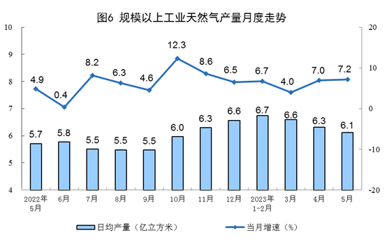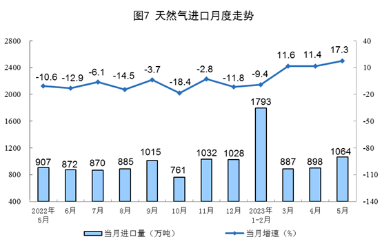 天然氣生產(chǎn)穩(wěn)步增長(zhǎng),進(jìn)口增速加快。5月份,生產(chǎn)天然氣190億立方米,同比增長(zhǎng)7.2%,增速比4月份加快0.2個(gè)百分點(diǎn),日均產(chǎn)量6.1億立方米。進(jìn)口天然氣1064萬(wàn)噸,同比增長(zhǎng)17.3%,增速比4月份加快5.9個(gè)百分點(diǎn)。