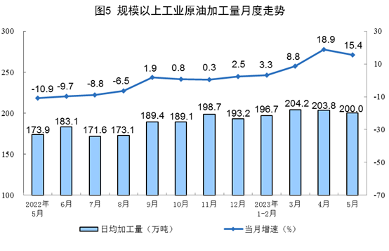 原油加工保持較快增長(zhǎng),增速有所回落。5月份,加工原油6200萬(wàn)噸,同比增長(zhǎng)15.4%,增速比4月份回落3.5個(gè)百分點(diǎn),日均加工原油200.0萬(wàn)噸。1—5月份,加工原油30263萬(wàn)噸,同比增長(zhǎng)9.8%。