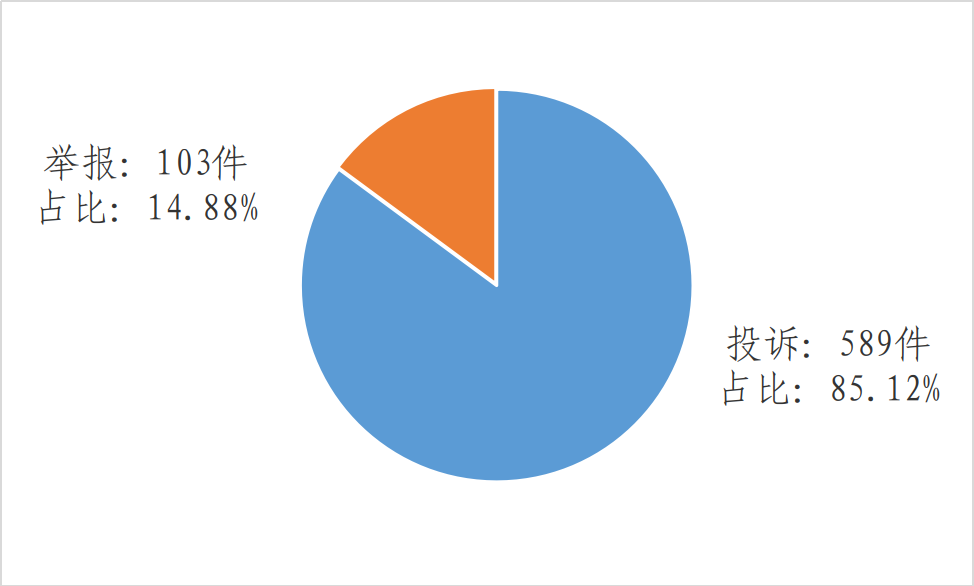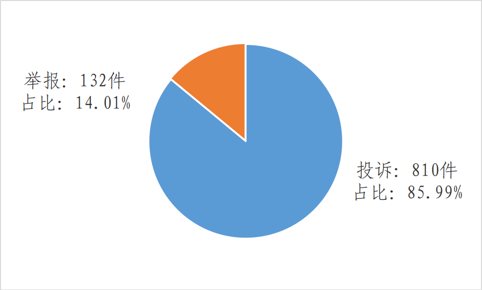 2023年6月,12398熱線共接收投訴舉報(bào)942件,環(huán)比增長(zhǎng)19.85%、同比下降34.76%。其中:投訴810件,環(huán)比增長(zhǎng)17.39%、同比下降41.39%;舉報(bào)132件,環(huán)比增長(zhǎng)37.50%、同比增長(zhǎng)112.90%。