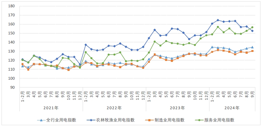 2024年9月,全行業(yè)用電指數(shù)為134.6,全行業(yè)用電量比2020年基期增長了34.6%,年均增長7.7%,同比增長5.6%,全行業(yè)用電量保持平穩(wěn)增長。