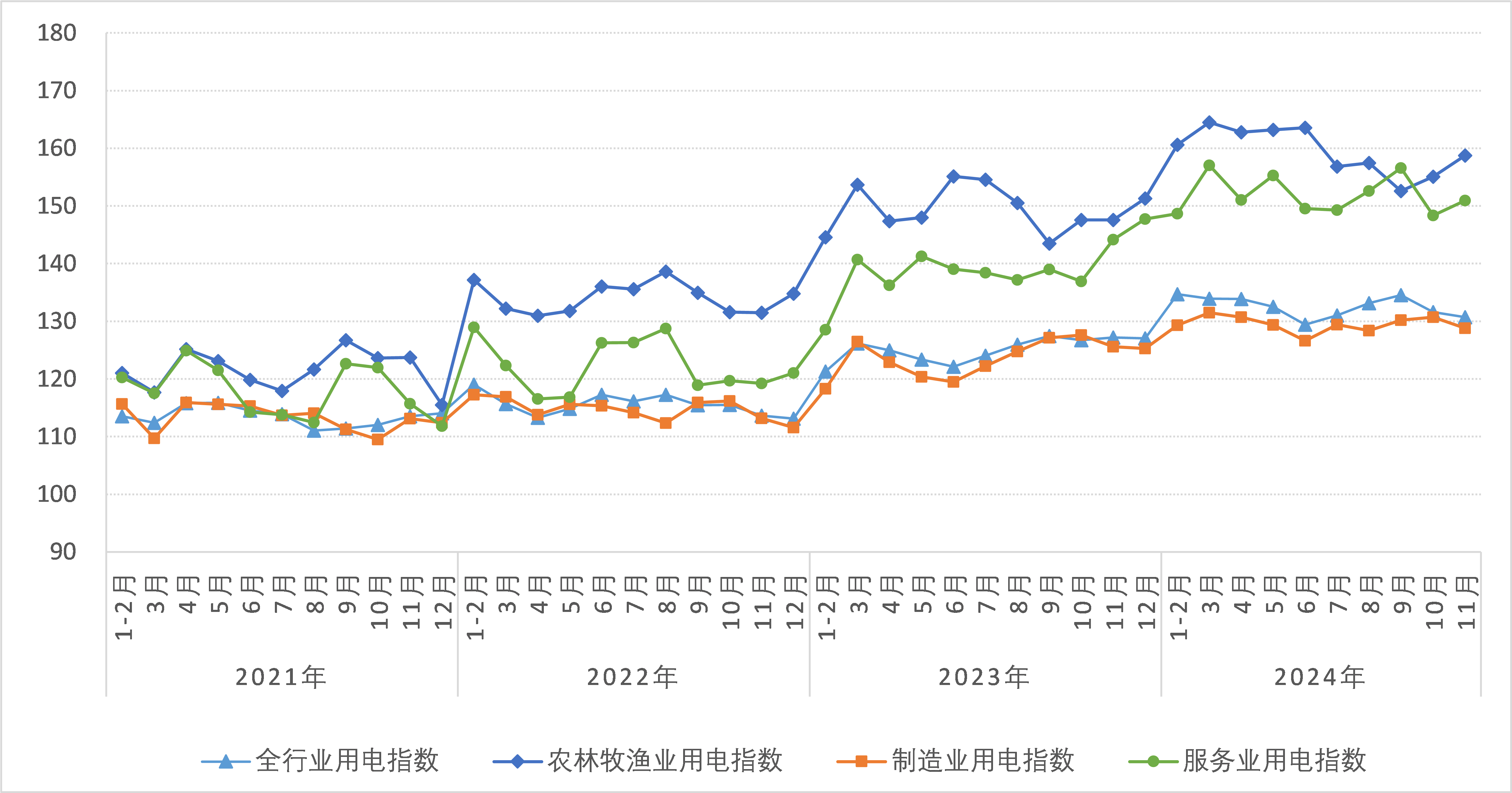 11月,農(nóng)林牧漁業(yè)用電指數(shù)為158.8,比2020年基期增長(zhǎng)了58.8%,年均增長(zhǎng)12.3%,同比增長(zhǎng)7.6%。