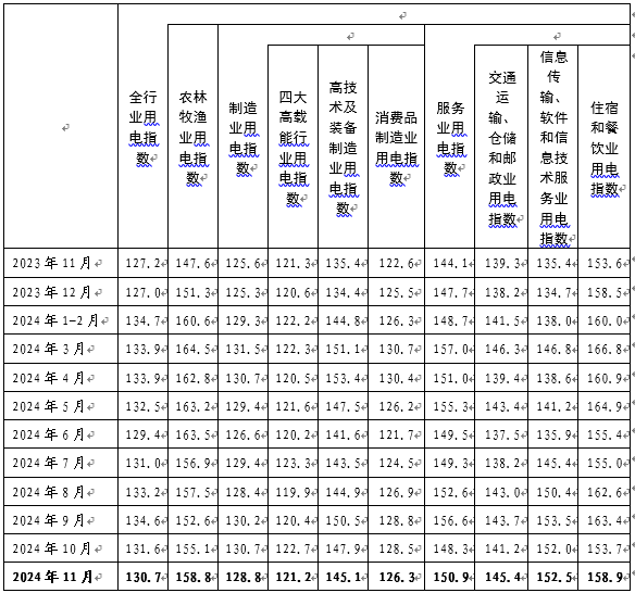 2024年11月,全行業(yè)用電指數(shù)為130.7,全行業(yè)用電量比2020年基期增長(zhǎng)了30.7%,年均增長(zhǎng)6.9%,同比增長(zhǎng)2.8%。