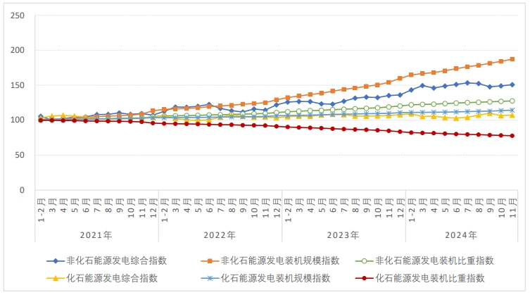 化石能源發(fā)電裝機規(guī)模指數(shù)為114.3,“十四五”以來化石能源發(fā)電裝機規(guī)模累計增長了14.3%,同比增長4.0%?;茉窗l(fā)電裝機比重指數(shù)為77.7,“十四五”以來化石能源發(fā)電裝機比重累計下降了22.3%(比重從2020年底的55.2%降至2024年11月底的42.9%),隨著新能源裝機的快速增長,化石能源裝機比重持續(xù)下降。