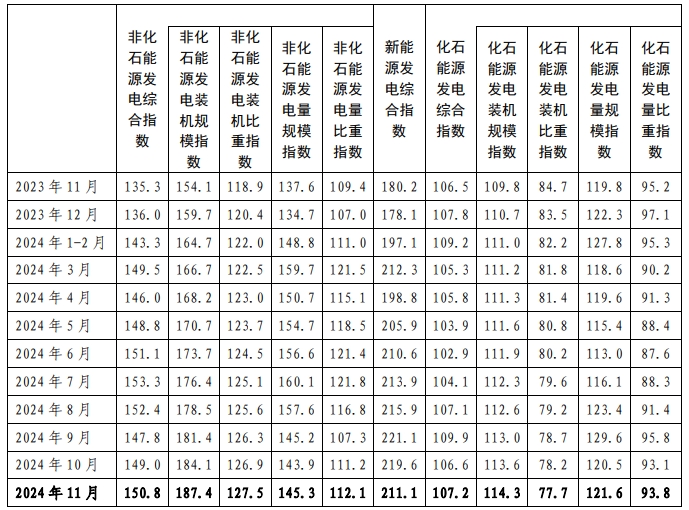2024年11月,非化石能源發(fā)電綜合指數(shù)為150.8,比2020年基期增長了50.8%,同比增長11.5%;其中,新能源發(fā)電綜合指數(shù)為211.1,比2020年基期增長了111.1%,同比增長17.1%。在“雙碳”目標引領(lǐng)下,非化石能源及其新能源發(fā)電綜合指數(shù)保持快速增長態(tài)勢。其中: