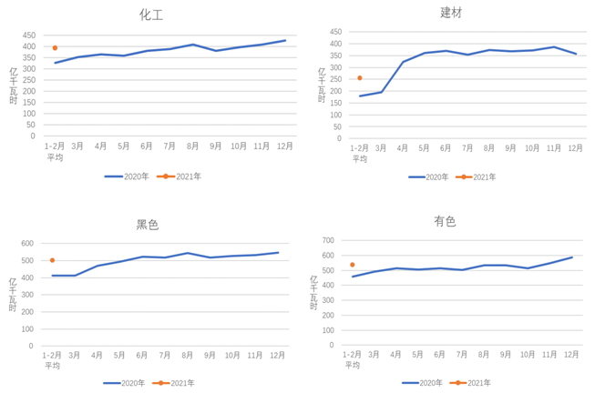 1-2月,化工行業(yè)用電量790億千瓦時(shí),同比增長(zhǎng)14.3%,增速比上年同期提高22.1個(gè)百分點(diǎn);建材行業(yè)用電量512億千瓦時(shí),同比增長(zhǎng)39.4%,增速比上年同期提高57.8個(gè)百分點(diǎn);黑色金屬冶煉行業(yè)用電量1006億千瓦時(shí),同比增長(zhǎng)18.8%,增速比上年同期提高21.6個(gè)百分點(diǎn);有色金屬冶煉行業(yè)用電量1074億千瓦時(shí),同比增長(zhǎng)12.7%,增速比上年同期提高13.9個(gè)百分點(diǎn)。