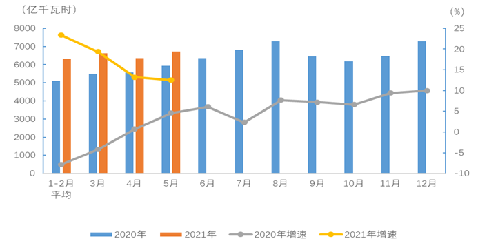 1-5月,全國全社會用電量32305億千瓦時,同比增長17.7%,其中,5月份全國全社會用電量6724億千瓦時,同比增長12.5%。