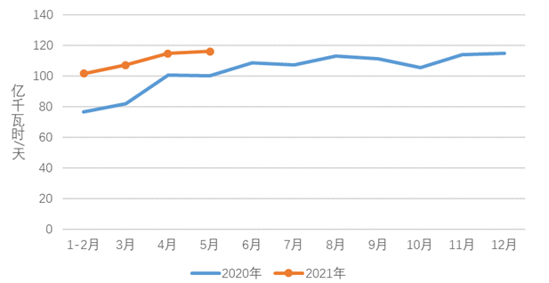 1-5月,化工行業(yè)用電量2048億千瓦時,同比增長12.8%,增速比上年同期提高17.0個百分點(diǎn);建材行業(yè)用電量1580億千瓦時,同比增長24.4%,增速比上年同期提高31.8個百分點(diǎn);黑色金屬冶煉行業(yè)用電量2639億千瓦時,同比增長18.3%,增速比上年同期提高19.8個百分點(diǎn);有色金屬冶煉行業(yè)用電量2763億千瓦時,同比增長10.2%,增速比上年同期提高8.2個百分點(diǎn)。