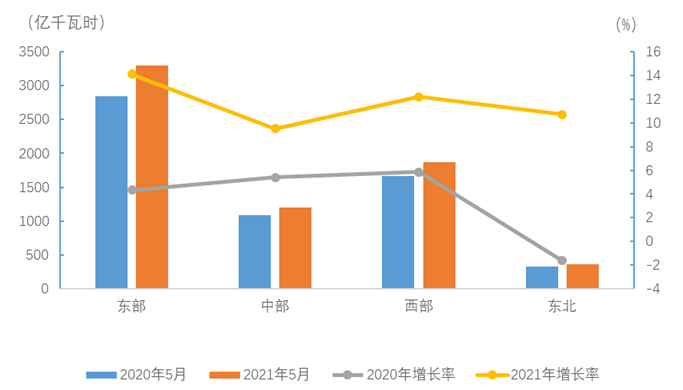 5月份,東、中、西部和東北地區(qū)全社會用電量增速分別為14.1%、9.5%、12.2%和10.7%。