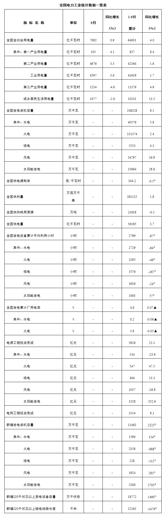 10月24日,國家能源局發(fā)布1-9月份全國電力工業(yè)統(tǒng)計(jì)數(shù)據(jù)。