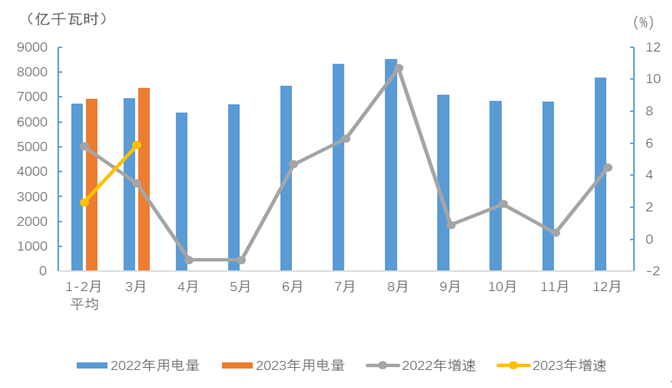 圖1 2022、2023年分月全社會(huì)用電量及其增速