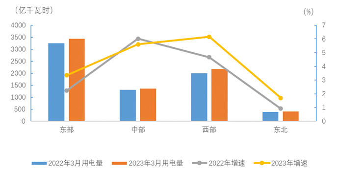 3月份,東、中、西部和東北地區(qū)全社會(huì)用電量增速分別為5.7%、4.3%、7.4%和5.4%。
