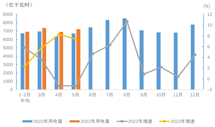 5月份,化工行業(yè)用電量469億千瓦時,同比增長0.5%;建材行業(yè)用電量395億千瓦時,同比增長5.7%;黑色金屬冶煉行業(yè)用電量518億千瓦時,同比下降8.2%;有色金屬冶煉行業(yè)用電量648億千瓦時,同比增長1.7%。