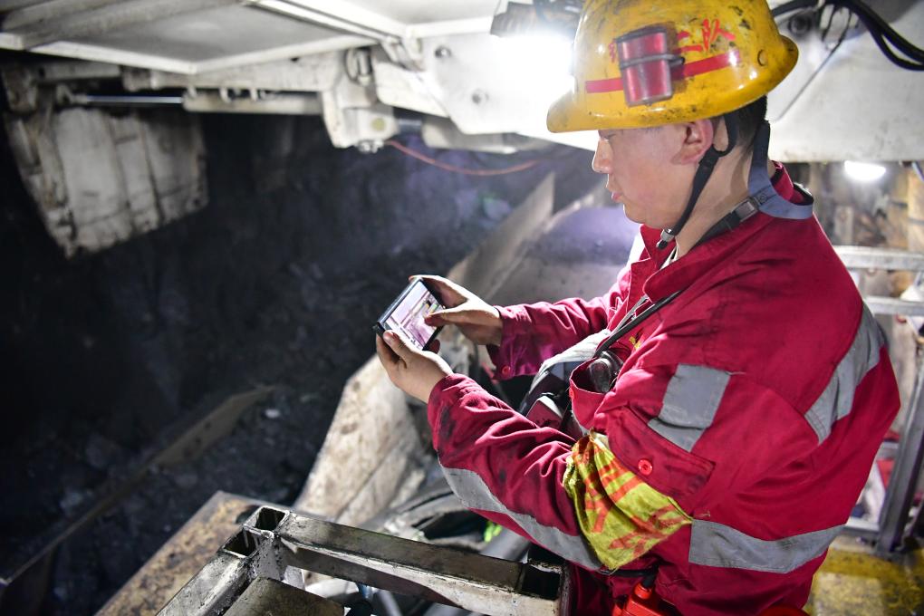 在曹家灘智慧礦山智能化工作面內(nèi),綜采二隊機電副隊長蔡進通過操作手機控制生產(chǎn)設(shè)備(2021年10月12日攝)。新華社記者 邵瑞 攝