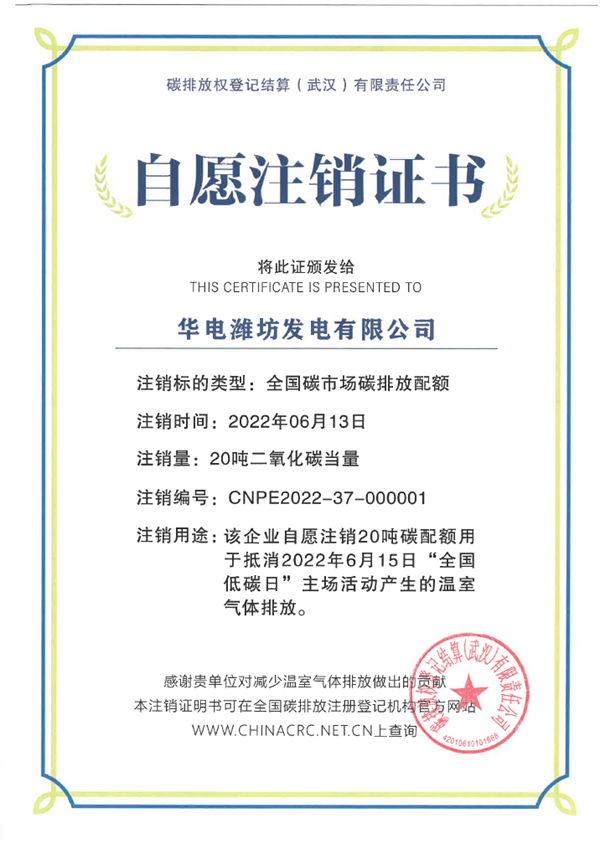 近年來,中國華電深入貫徹落實(shí)習(xí)近平生態(tài)文明思想,弘揚(yáng)綠色低碳理念,增強(qiáng)節(jié)能降碳意識,推動高質(zhì)量發(fā)展,助力“雙碳”目標(biāo)實(shí)現(xiàn)。6月15日,由生態(tài)環(huán)境部、山東省人民政府共同主辦的2022年“全國低碳日”主場活動將在濟(jì)南舉行,活動主題為“落實(shí)‘雙碳’行動 共建美麗家園”。華電濰坊公司自愿為本次活動捐贈全國碳配額20噸,碳排放登記結(jié)算(武漢)有限責(zé)任公司為其頒發(fā)了“全國碳市場碳排放配額自愿注銷證書”。