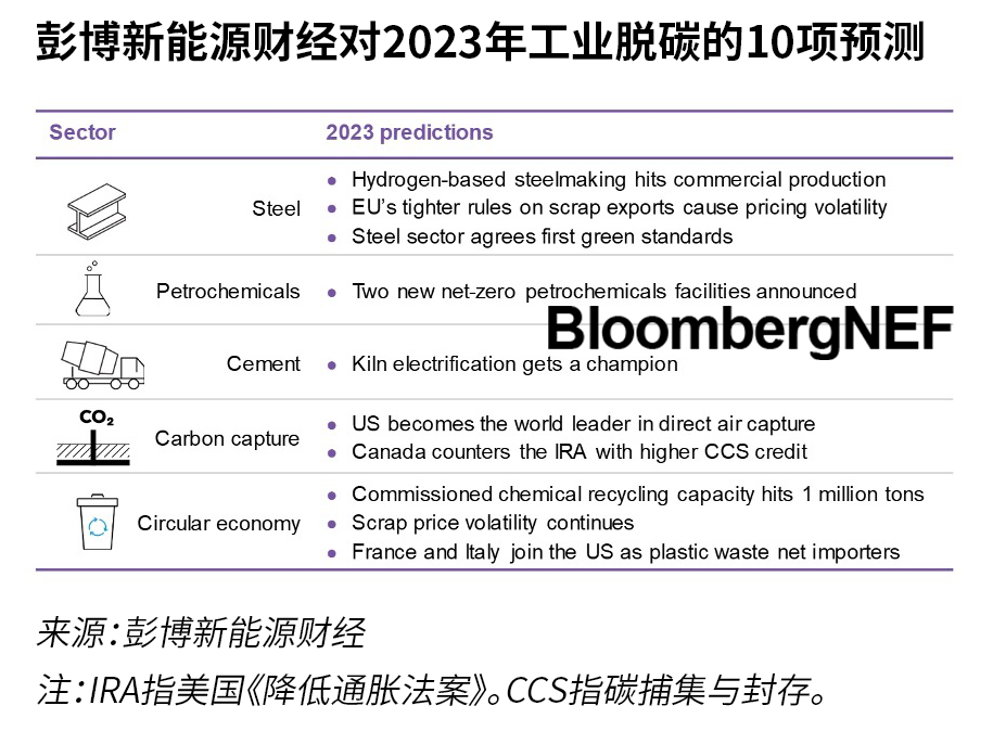 長(zhǎng)期以來(lái)被認(rèn)為難以減排的工業(yè)部門正在以比預(yù)期更快的速度脫碳。歐洲已經(jīng)開(kāi)始綠鋼試點(diǎn)生產(chǎn),水泥廠正在宣布全面的碳捕集裝置,加拿大和法國(guó)正在建造凈零石化綜合設(shè)施。2023年還會(huì)有更多此類行動(dòng)。