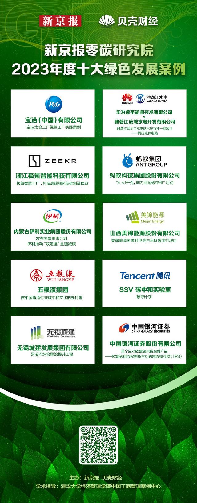 12月12日,在新京報(bào)零碳研究院2023綠色發(fā)展峰會上,由新京報(bào)零碳研究院和清華大學(xué)經(jīng)管學(xué)院中國工商管理案例中心共同評選出的“2023年度綠色發(fā)展十大案例”正式公布。入圍案例涵蓋新能源大規(guī)模開發(fā)利用、城市生態(tài)治理、綠色制造、低碳技術(shù)、碳足跡、碳金融和碳普惠等重點(diǎn)領(lǐng)域,基本代表了2023年度綠色發(fā)展的主要方向。其中,中國銀河、無錫城建、螞蟻集團(tuán)、伊利、騰訊、寶潔中國、五糧液、極氪、山西美錦能源、華為數(shù)字能源等項(xiàng)目入圍。加強(qiáng)“雙碳”相關(guān)項(xiàng)目和技術(shù)試點(diǎn)示范對推動和引領(lǐng)經(jīng)濟(jì)社會各領(lǐng)域綠色低碳轉(zhuǎn)型至關(guān)重要。
