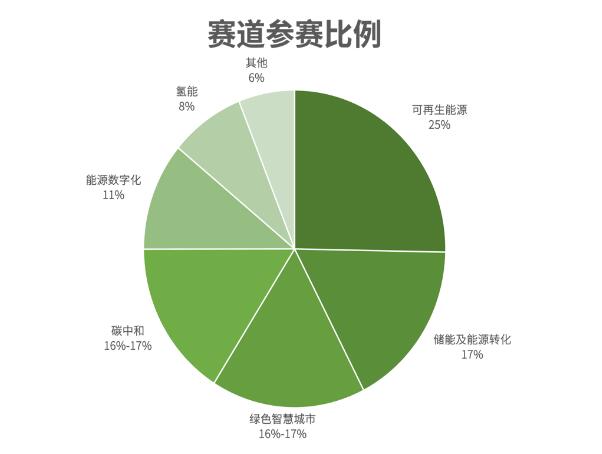 在全球轉型非化石能源,以及氣候行動加速的大趨勢下,可再生能源賽道是今年大賽的最熱門賽道,項目占比25%,緊隨其后的是儲能及能源轉化賽道,占比17%。城市是人類應對氣候變化最重要的陣地,今年大賽新增綠色智慧城市賽道也受到廣泛關注,與碳中和賽道勢均力敵,兩個賽道占比均在16%-17%之間,能源數(shù)字化賽道占比11%,氫能賽道占比8%。其他創(chuàng)新項目占比6%。