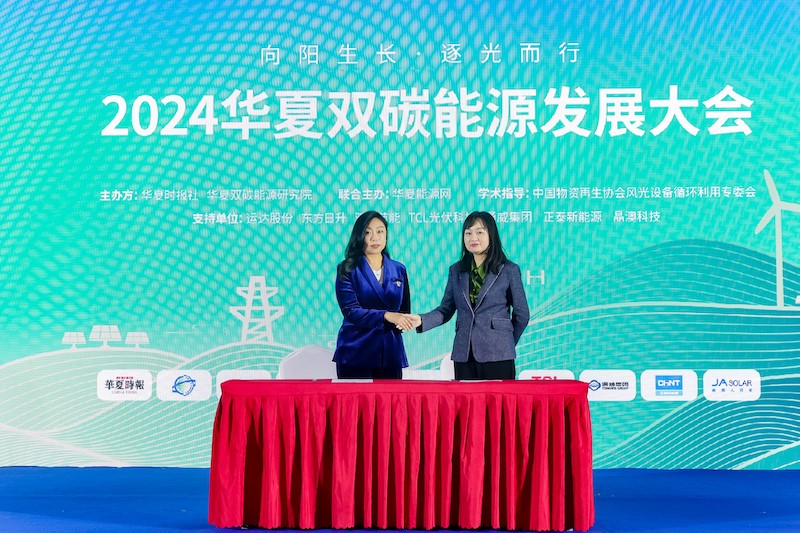 2024年3月28日,由華夏時報社、華夏雙碳能源研究院以及華夏能源網(wǎng)聯(lián)合主辦的“向陽生長·逐光而行——2024華夏雙碳能源發(fā)展大會”在北京圓滿舉辦,本次活動由中國物資再生協(xié)會風光設備循環(huán)利用專委會提供指導,運達股份、東方日升、雙良節(jié)能、TCL光伏科技、通威集團、正泰新能源、晶澳科技、金螳螂給予特別支持。大會不僅相繼發(fā)布了風光儲各領域發(fā)展新質生產力倡議書,還發(fā)布了全球綠色工商低碳發(fā)展倡議書。同時,還舉行了雙碳應用戰(zhàn)略合作簽約、華夏雙碳能源研究院專家聘書頒發(fā)等多項儀式。