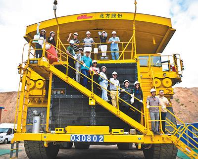 國(guó)際青年代表在國(guó)能準(zhǔn)能集團(tuán)綠色礦山登上無(wú)人駕駛卡車合影留念。 圖為本報(bào)記者吳勇攝
