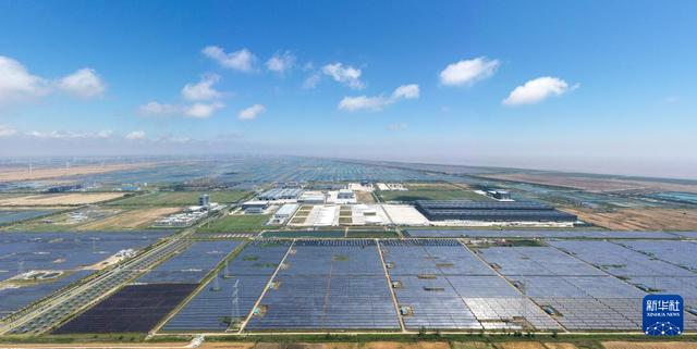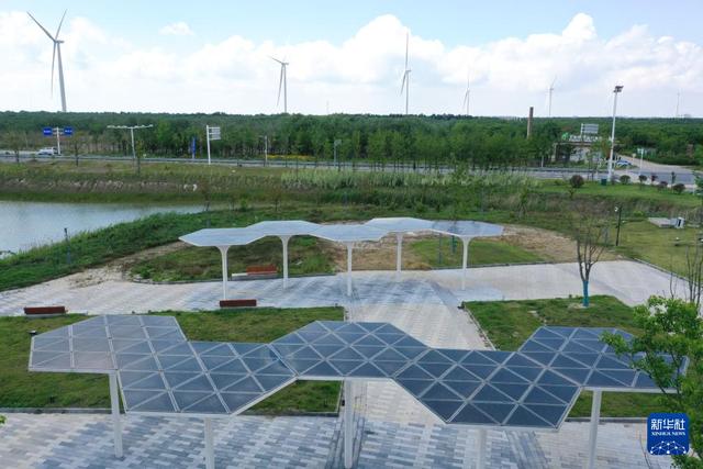 6月6日在射陽港低(零)碳產(chǎn)業(yè)園拍攝的長(zhǎng)廊頂部太陽能光伏系統(tǒng)(無人機(jī)照片)。新華社記者 楊磊 攝