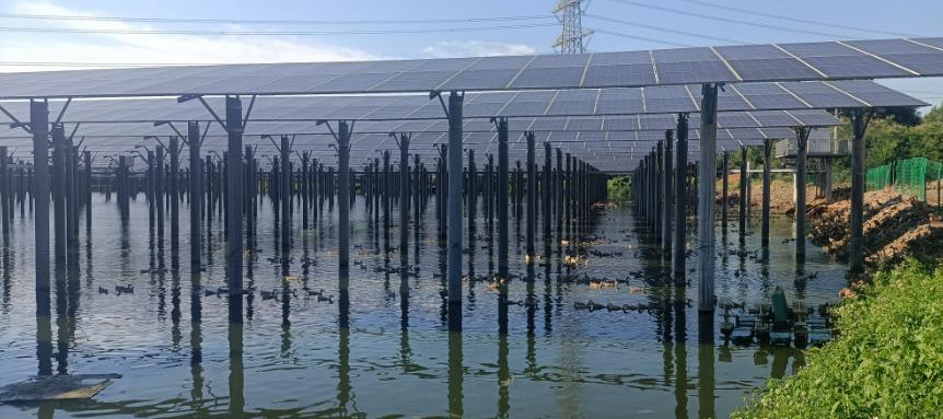 平坡光伏電站位于湛江市良垌鎮(zhèn),總裝機容量90兆瓦,項目采用漁光互補模式,在1650畝水養(yǎng)殖魚塘上架設(shè)光伏組件,利用水面上的光伏組件發(fā)電,水下則可進行水產(chǎn)魚、鴨養(yǎng)殖。同時,經(jīng)充分考慮白鷺等趨光性鳥類的生活特性,項目采用透光率極高的單晶雙玻雙面太陽能電池,其透光率達95%以上,因此,光伏陣列的反射光極少,很好地保障了鳥類生活環(huán)境不受破壞,實現(xiàn)了生態(tài)保護和能源綠色發(fā)展雙贏。