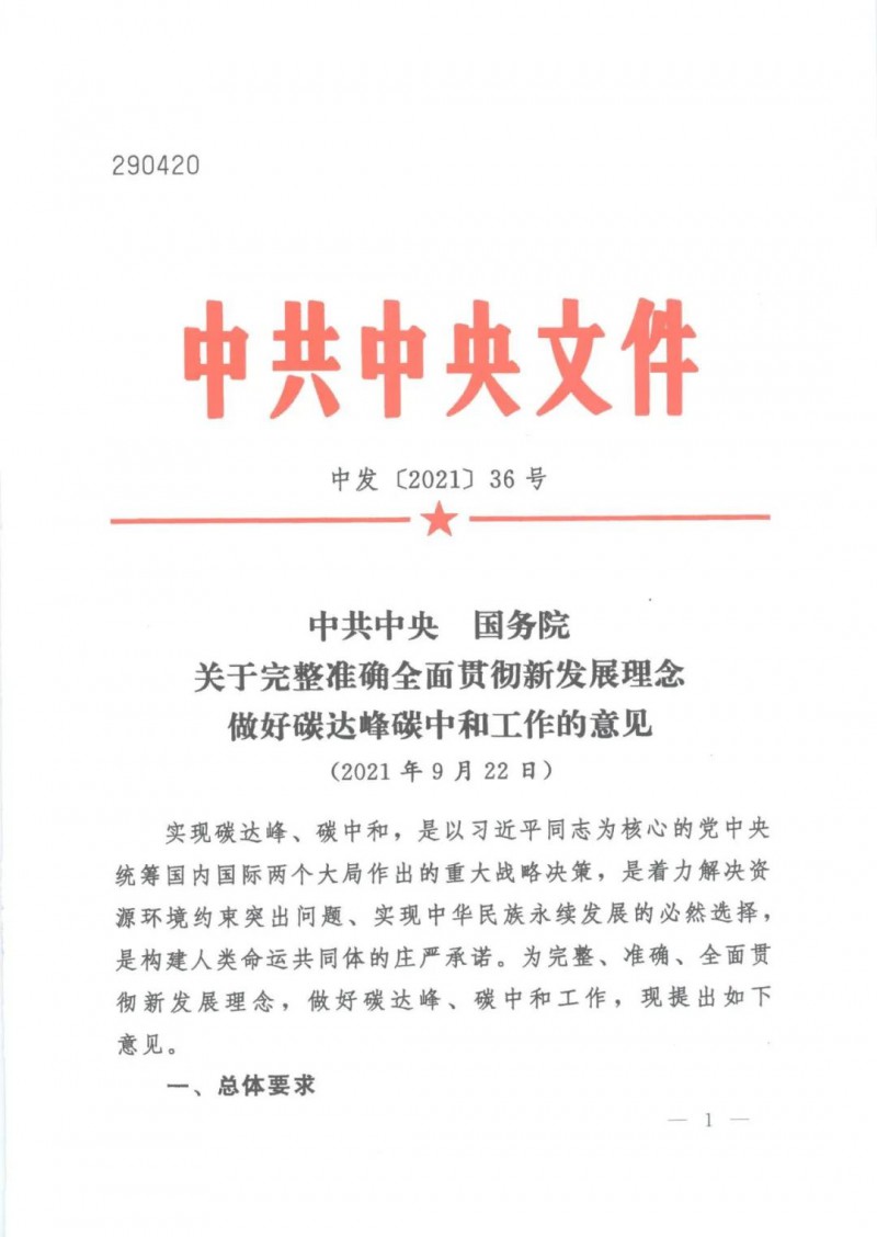 9月22日,中共中央下發(fā)《關(guān)于完整準(zhǔn)確全面貫徹新發(fā)展理念做好碳達(dá)峰碳中和工作的意見(jiàn)》。