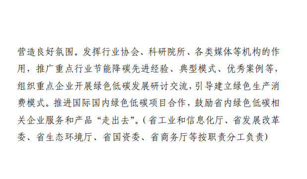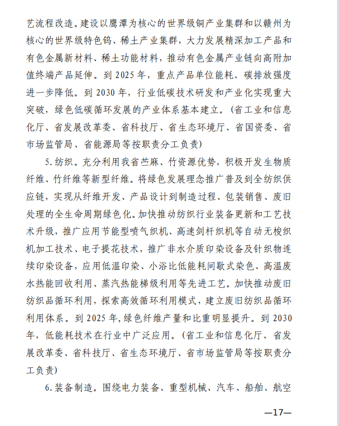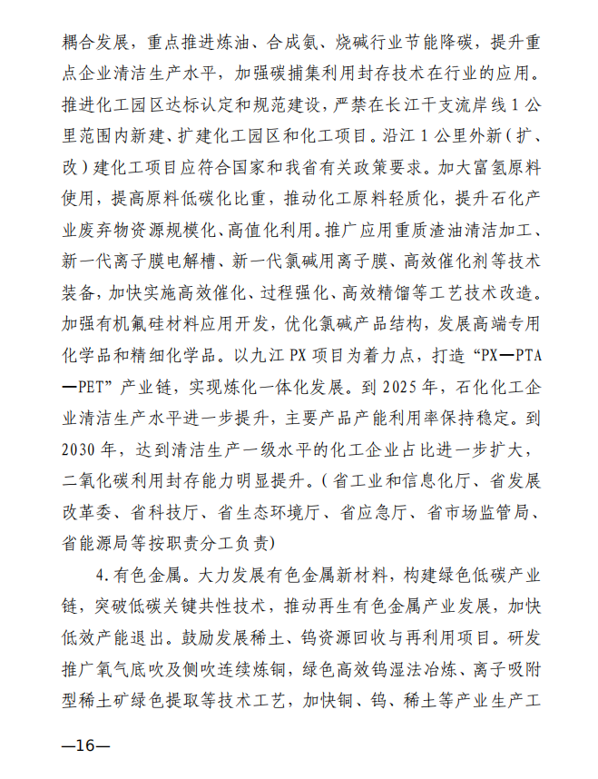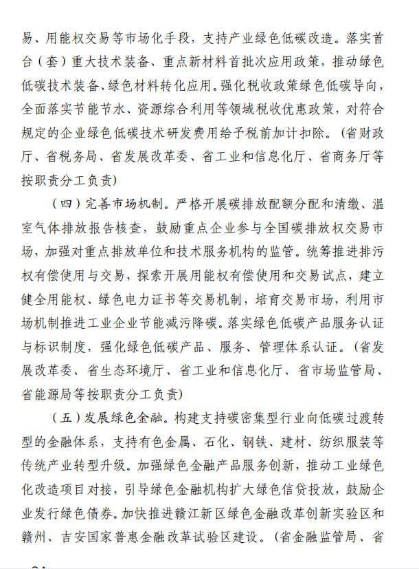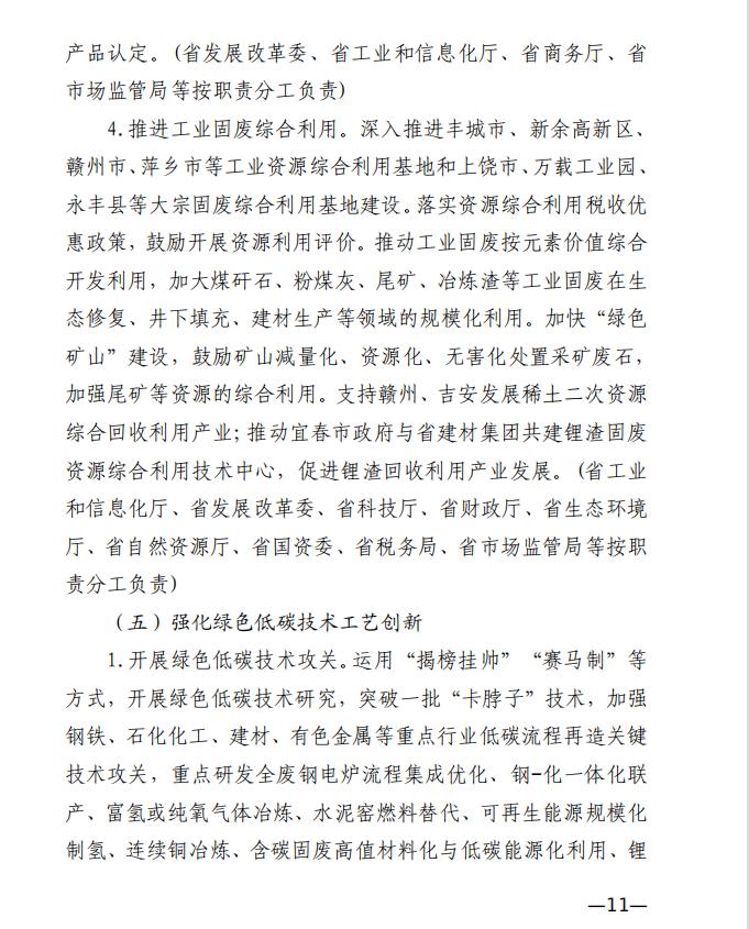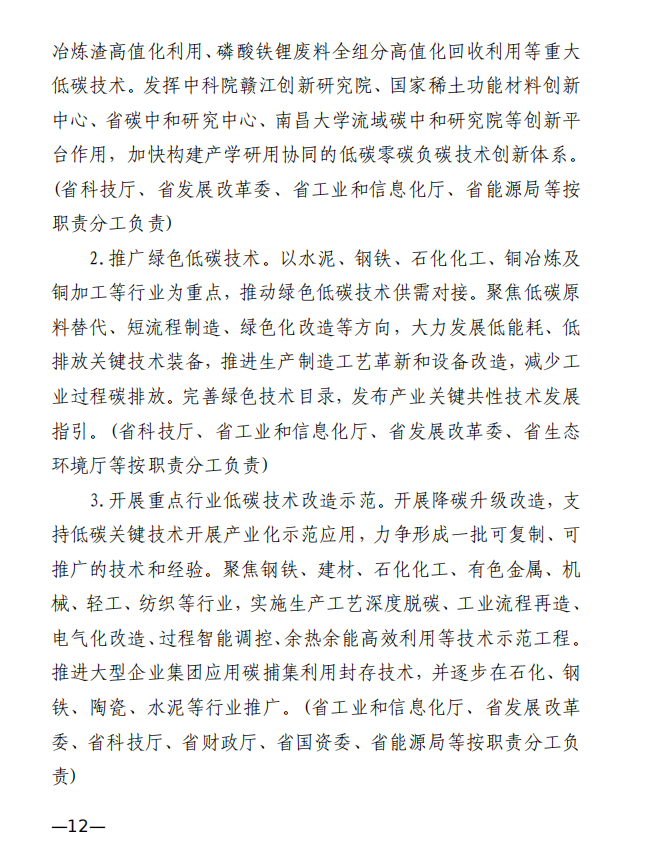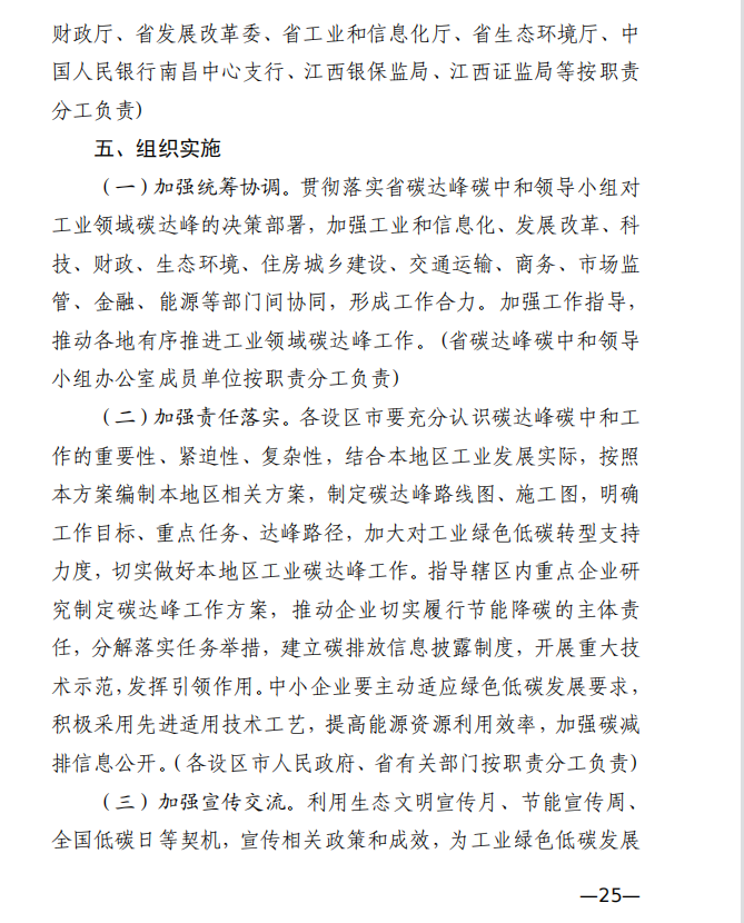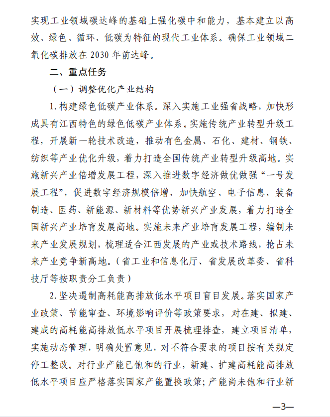 10月10日,江西省工業(yè)和信息化廳、江西省發(fā)展和改革委員會(huì)和江西省生態(tài)環(huán)境廳發(fā)布《關(guān)于印發(fā)江西省工業(yè)領(lǐng)域碳達(dá)峰實(shí)施方案的通知》,《江西省工業(yè)領(lǐng)域碳達(dá)峰實(shí)施方案》提出,“十四五”期間,江西力爭產(chǎn)業(yè)結(jié)構(gòu)與用能結(jié)構(gòu)優(yōu)化取得積極進(jìn)展,能源資源利用效率明顯提升,綠色工廠和綠色園區(qū)分別達(dá)到200家和50家;到2025年,全省規(guī)模以上工業(yè)單位增加值能耗較2020年下降12%以上?!笆逦濉逼陂g,力爭一批重點(diǎn)產(chǎn)品工藝能效達(dá)到國內(nèi)領(lǐng)先水平,基本建立以高效、綠色、循環(huán)、低碳為特征的現(xiàn)代工業(yè)體系;確保工業(yè)領(lǐng)域二氧化碳排放在2030年前達(dá)峰。
