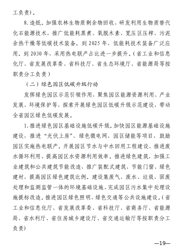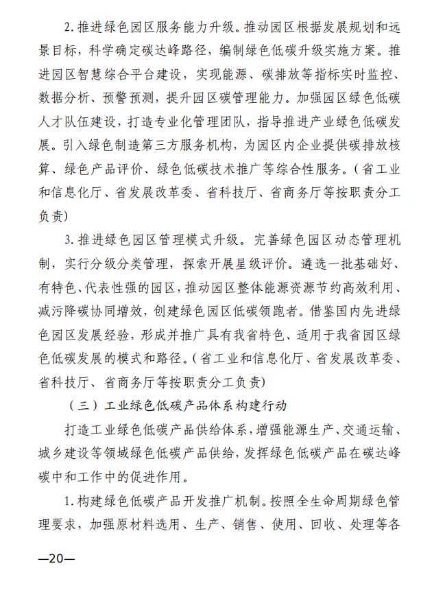 發(fā)揮綠色園區(qū)示范引領(lǐng)作用,聚焦園區(qū)能源資源利用、產(chǎn)業(yè) 發(fā)展、環(huán)境保護(hù)等,探索開展綠色園區(qū)低碳升級(jí)示范建設(shè),帶動(dòng) 全省園區(qū)綠色低碳發(fā)展。 推進(jìn)綠色園區(qū)基礎(chǔ)設(shè)施低碳升級(jí)。加快園區(qū)能源基礎(chǔ)設(shè)施建設(shè),推進(jìn)“光伏上房”、綠色微電網(wǎng)、園區(qū)儲(chǔ)能等項(xiàng)目,鼓勵(lì)園區(qū)實(shí)施熱電聯(lián)產(chǎn)。
