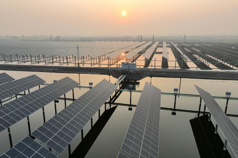 水面光伏發(fā)電項(xiàng)目俯瞰圖。(楊軍攝)