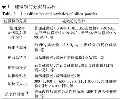 硅微粉:硅微粉產(chǎn)品系列比較復(fù)雜,應(yīng)用十分廣泛,除大型集成電路和芯片用硅微粉對SiO2純度有更高要求外,其它硅微粉通常要求w(SiO2)99%~99.9%,w(TFe)<100ppm。如表1所示,根據(jù)國家標(biāo)準(zhǔn)SJ/T10675—2002和筆者研究認(rèn)識,硅微粉有多種分類和品種。