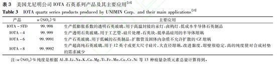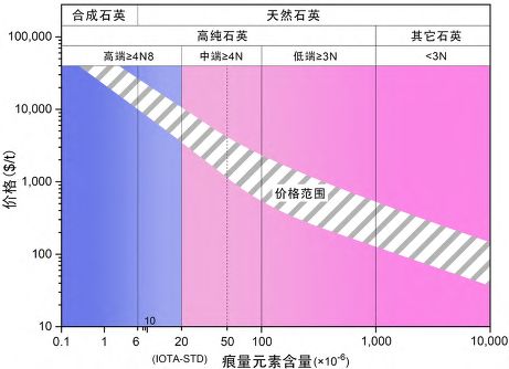 石英礦物原料的 SiO2 純度與價(jià)格的關(guān)系: IOTA-STD為美國尤尼明公司 ( Unimin Corp.) 生產(chǎn)的SiO2純度≥99.998% ( 4N8)的高純石英高端產(chǎn)品