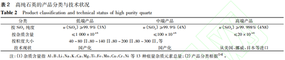 高純石英(high-purityquartz)是SiO2純度大于99.9%的石英系列產(chǎn)品的總稱。如表2所示,其產(chǎn)品等級可按SiO2純度或Al、B、Li、K、Na、Ca、Mg、Ti、Fe、Mn、Cu、Cr、Ni等雜質(zhì)元素總量進(jìn)行劃分,每個(gè)等級的高純石英可按粒度分為不同粒度大小的品種。