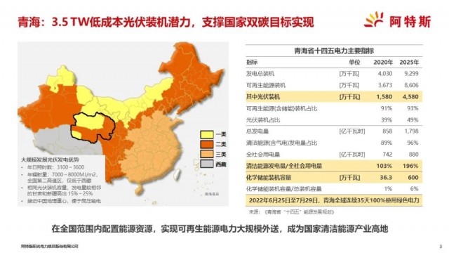 青海具有大規(guī)模發(fā)展光伏獨特的資源和區(qū)位優(yōu)勢,首先土地資源豐富,同時陽光燦爛,年日照時數(shù)3100~3600小時,年輻射量7,000~8,000 MJ/m2,位居全國第二位,僅低于西藏,相同光伏裝機容量,發(fā)電量較相鄰的甘肅和新疆高出15%~25%;青海接近中國地理中心,便于電力外送;全省光伏裝機資源潛力3.5TW,是目前全國光伏裝機總?cè)萘康氖抖?,光伏發(fā)電前景廣闊,是我國實現(xiàn)雙碳目標重要的資源支撐。
