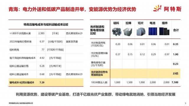 以前,在建設燃煤電站時,要做的經(jīng)濟分析是對比運煤和輸電成本。而我們今天在青海要做的是輸電和把電力就地轉(zhuǎn)化成產(chǎn)品的成本對比分析。在青海建設附加值高、技術(shù)和用能密集的多晶硅料,然后把部分多晶硅料就地加工成碳足跡低的綠色光伏組件產(chǎn)品,另一部分硅料運輸?shù)侥茉炊倘笔》菔褂谩?jù)國家發(fā)改委新近發(fā)布的三條特高壓線路的輸電價格,我們測算硅料運輸?shù)某杀静患拜旊姵杀镜?/7。