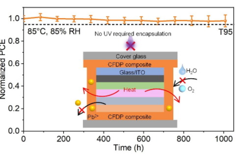 西北工業(yè)大學(xué)材料學(xué)院納米能源中心李炫華教授團(tuán)隊(duì)設(shè)計(jì)了一種室溫自交聯(lián)的氟硅聚合物凝膠,實(shí)現(xiàn)了鈣鈦礦太陽(yáng)能電池的室溫快速無(wú)損封裝。此外,團(tuán)隊(duì)提出的封裝策略有效地促進(jìn)了傳熱并減輕了熱量積累對(duì)封裝器件的潛在影響。實(shí)驗(yàn)結(jié)果表明,封裝器件在濕熱試驗(yàn)中經(jīng)過(guò)1000小時(shí)后仍保持98%的初始效率,在熱循環(huán)試驗(yàn)中經(jīng)過(guò)220次循環(huán)后仍保持95%的初始效率,滿足國(guó)際電工委員會(huì)IEC 61215的要求標(biāo)準(zhǔn)。同時(shí),由于氟硅聚合物凝膠出色的蓋板玻璃保護(hù)和對(duì)鉛的強(qiáng)螯合作用,封裝的器件分別在雨水測(cè)試和浸泡測(cè)試中表現(xiàn)出99%和98%的鉛泄漏抑制率。相比于傳統(tǒng)的POE封裝而言,該策略的提出為實(shí)現(xiàn)高效、穩(wěn)定和可持續(xù)的鈣鈦礦光伏電池提供了一種通用的集成解決方案。研究工作已被《自然-通訊》接收。