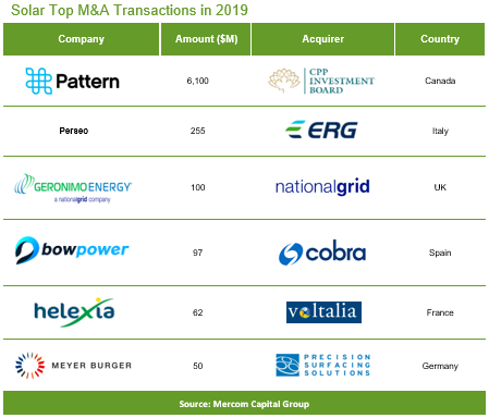 2019年,太陽能領(lǐng)域有65項(xiàng)并購(gòu)交易,而2018年為82宗。大多數(shù)交易涉及太陽能下游企業(yè)。2019年,BayWa,EDF可再生能源和Engie均收購(gòu)了兩家公司。 2019年最大的一筆交易是加拿大退休金計(jì)劃投資委員會(huì)(CPPIB)以61億美元收購(gòu)Pattern Energy的交易。