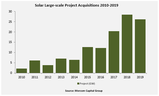 2019年,共有26吉瓦的大型太陽能項(xiàng)目易手,而2018年為29吉瓦。2019年有192個(gè)大型太陽能項(xiàng)目并購(gòu),而2018年為218個(gè)大型太陽能項(xiàng)目。