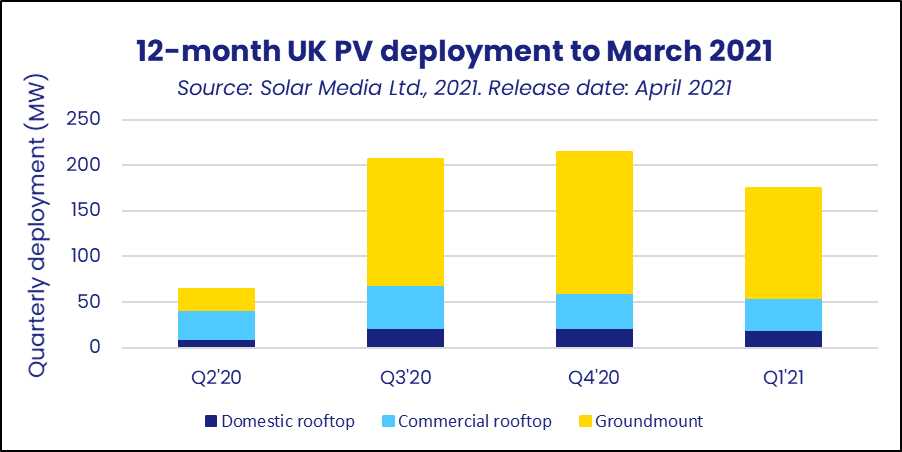 截止到3月底的12個(gè)月中,英國(guó)新增并網(wǎng)太陽(yáng)能發(fā)電容量660兆瓦。根據(jù)英國(guó)太陽(yáng)能協(xié)會(huì)數(shù)據(jù),預(yù)計(jì)2021年,全國(guó)新增安裝量可能達(dá)到1,000兆瓦,因?yàn)樵谌齻€(gè)主要市場(chǎng),即住宅,商業(yè)屋頂和地面安裝市場(chǎng)均實(shí)現(xiàn)增長(zhǎng)。