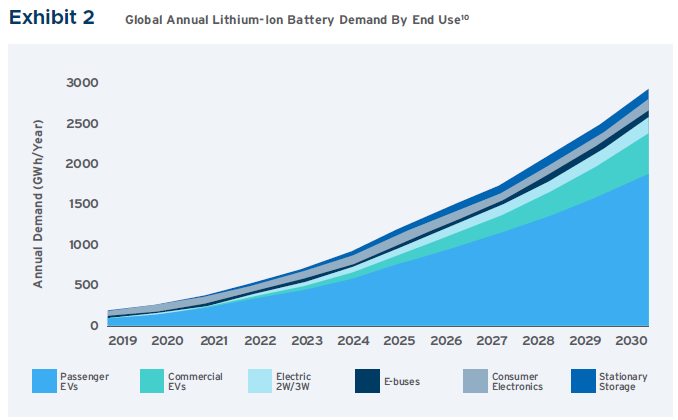 根據(jù)RMI公司的研究和彭博新能源財經(jīng)公司的分析,到2030年,全球?qū)︿囯x子電池的需求預(yù)計將達到每年2.8TW。其中大部分將滿足電動汽車需求。
