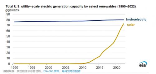 由于太陽(yáng)能裝機(jī)容量呈指數(shù)級(jí)增長(zhǎng),今年夏天太陽(yáng)能發(fā)電再次超過(guò)水力發(fā)電。2009年至2022年,太陽(yáng)能裝機(jī)容量平均每年增長(zhǎng)44%,水力發(fā)電裝機(jī)容量每年增長(zhǎng)不到1%。在我們的STEO中,我們預(yù)計(jì)太陽(yáng)能發(fā)電量將在2024年首次超過(guò)水力發(fā)電量。2019年,年風(fēng)電發(fā)電量超過(guò)年水電發(fā)電量。美國(guó)太陽(yáng)能和風(fēng)力發(fā)電的增長(zhǎng)遵循類似的模式,兩者都主要跟隨裝機(jī)容量的增長(zhǎng)。