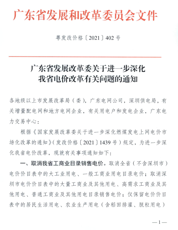 日前,廣東省發(fā)展改革委印發(fā)《關(guān)于進(jìn)一步深化我省電價(jià)改革有關(guān)問(wèn)題的通知》,通知明確,取消工商業(yè)目錄銷(xiāo)售電價(jià);保持居民、農(nóng)業(yè)用電價(jià)格穩(wěn)定; 完善電力市場(chǎng)交易;推動(dòng)工商業(yè)用戶(hù)都進(jìn)入市場(chǎng);建立健全電網(wǎng)企業(yè)代理購(gòu)電機(jī)制;加強(qiáng)與分時(shí)電價(jià)政策銜接。