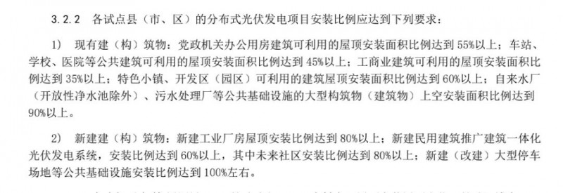 各試點縣(市、區(qū))的分布式光伏發(fā)電項目安裝比例也提出了現(xiàn)有建筑物和新增建筑物的安裝比例方面也提出一定要求。